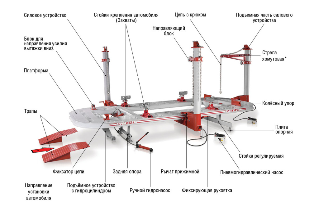 Платформа из листового металла овальной формы, одно силовое устройство башенного типа с максимальным усилием вытяжки 10 т каждое. Пожизненная гарантия на платформу стенда.